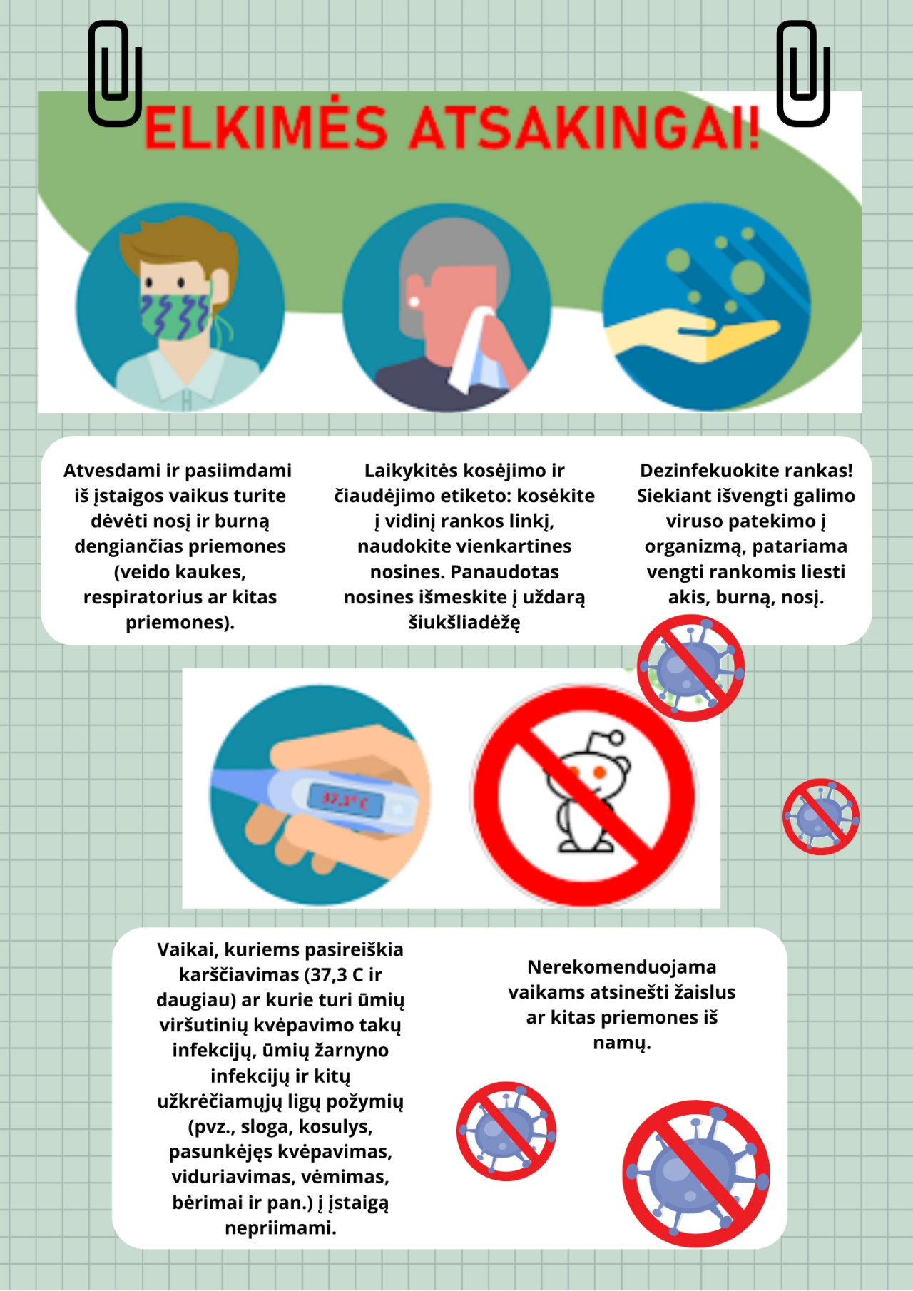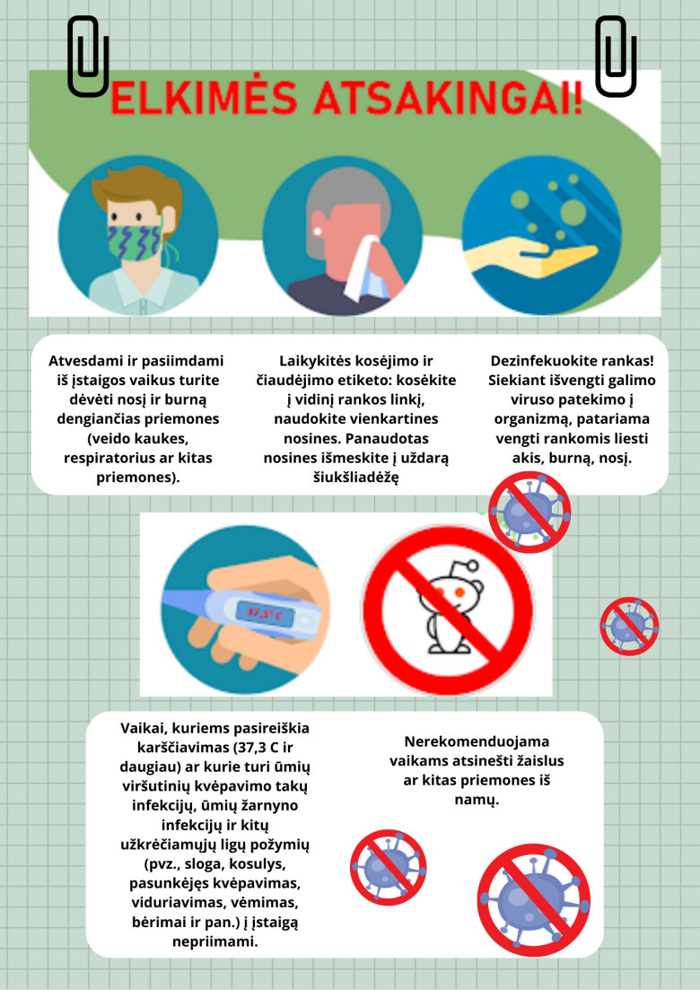- ugdymo paslaugų teikimo vietoje dirba tik darbuotojai, neturintys ūmių viršutinių kvėpavimo takų ligų ir kitų užkrečiamųjų ligų požymių (pvz., karščiavimas, sloga, kosulys, pasunkėjęs kvėpavimas ir pan.). Darbuotojų sveikata nuolat stebima;