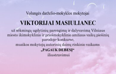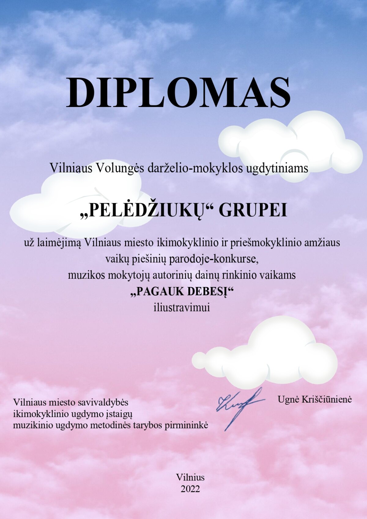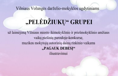 Džiaugiamės ir labai didžiuojamės "Pelėdžiukų" gr. vaikais, nes vaikų bendras piešinys tapo Vilniaus miesto ikimokyklinio ir priešmokyklinio amžiaus vaikų piešinių parodos-konkurso, muzikos mokytojų autorinių dainų rinkinio vaikams „Pagauk debesį!“ iliustravimui nominantu!!!