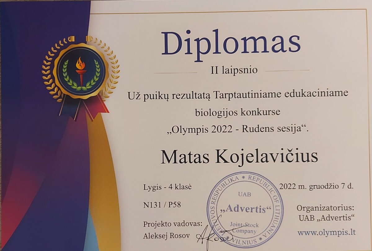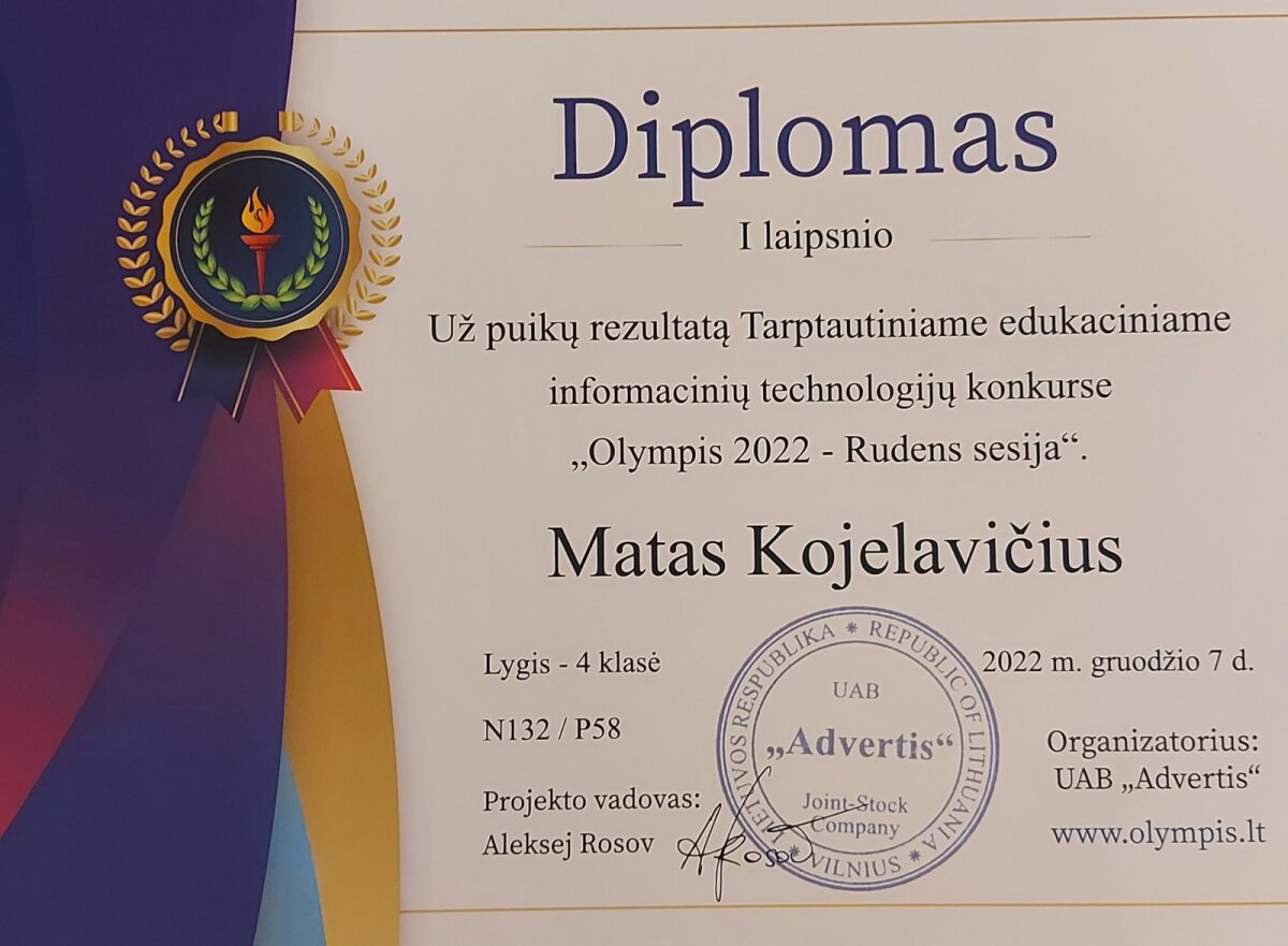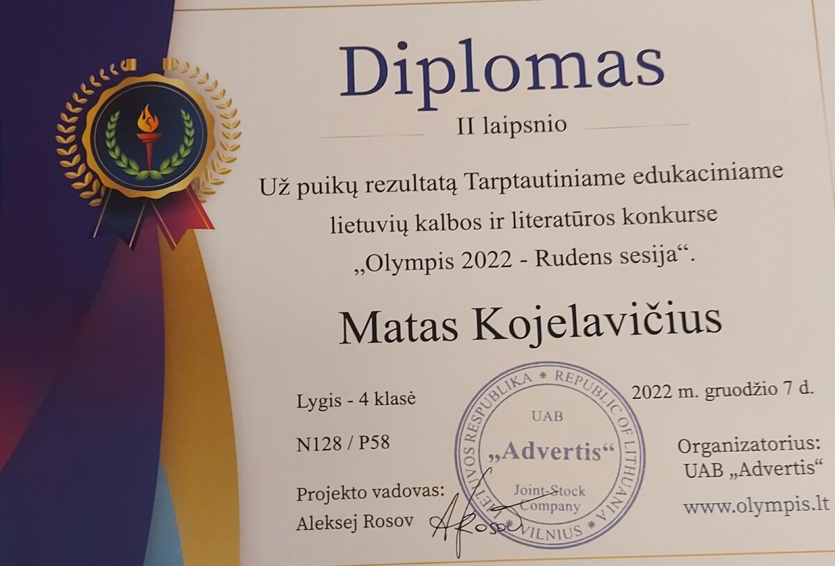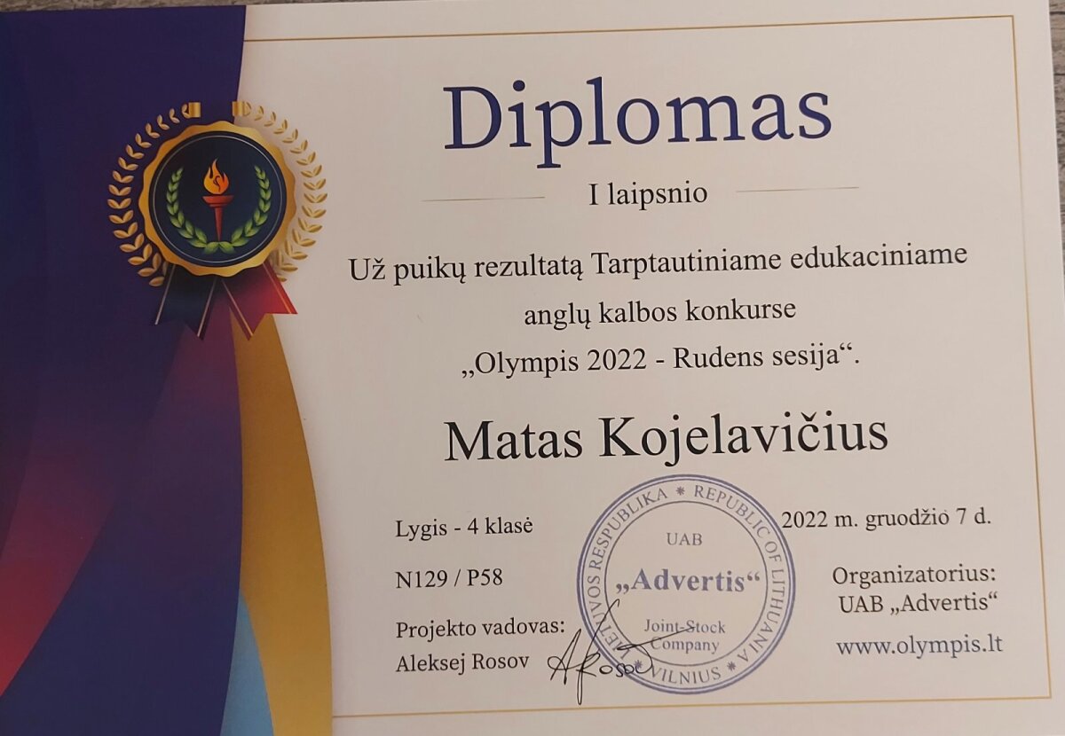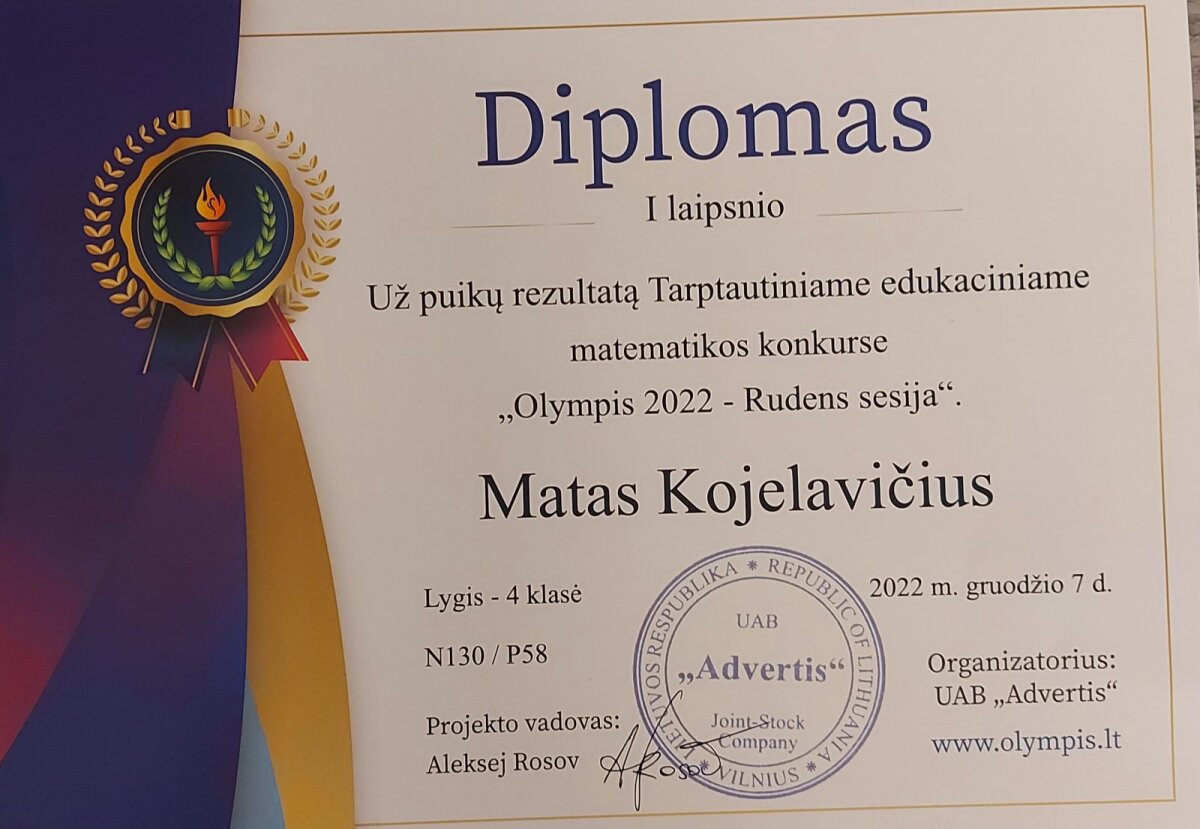 4 klasės mokinys M.Kojelavičius dalyvo Tarptautiniame edukaciniame konkurse “Olympis 2022 – Rudens sesija”. Edukaciniame anglų kalbos konkurse gavo I laipsnio diplomą. Lietuvių kalbos ir literatūros konkurse II laipsnio diplomą ir biologijos konkurse II laipsnio diplomą. Informacinių technologijų konkurse buvo įteiktas I laipsnio diplomas, o matematikos konkurse I laipsnio diplomas. Sveikiname!