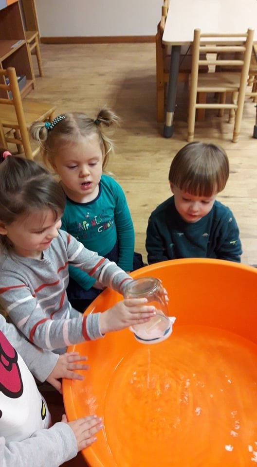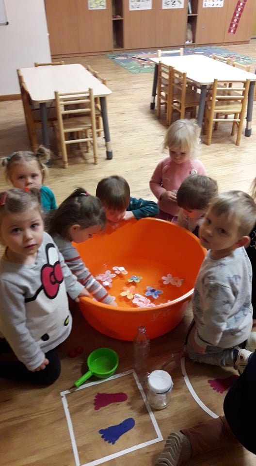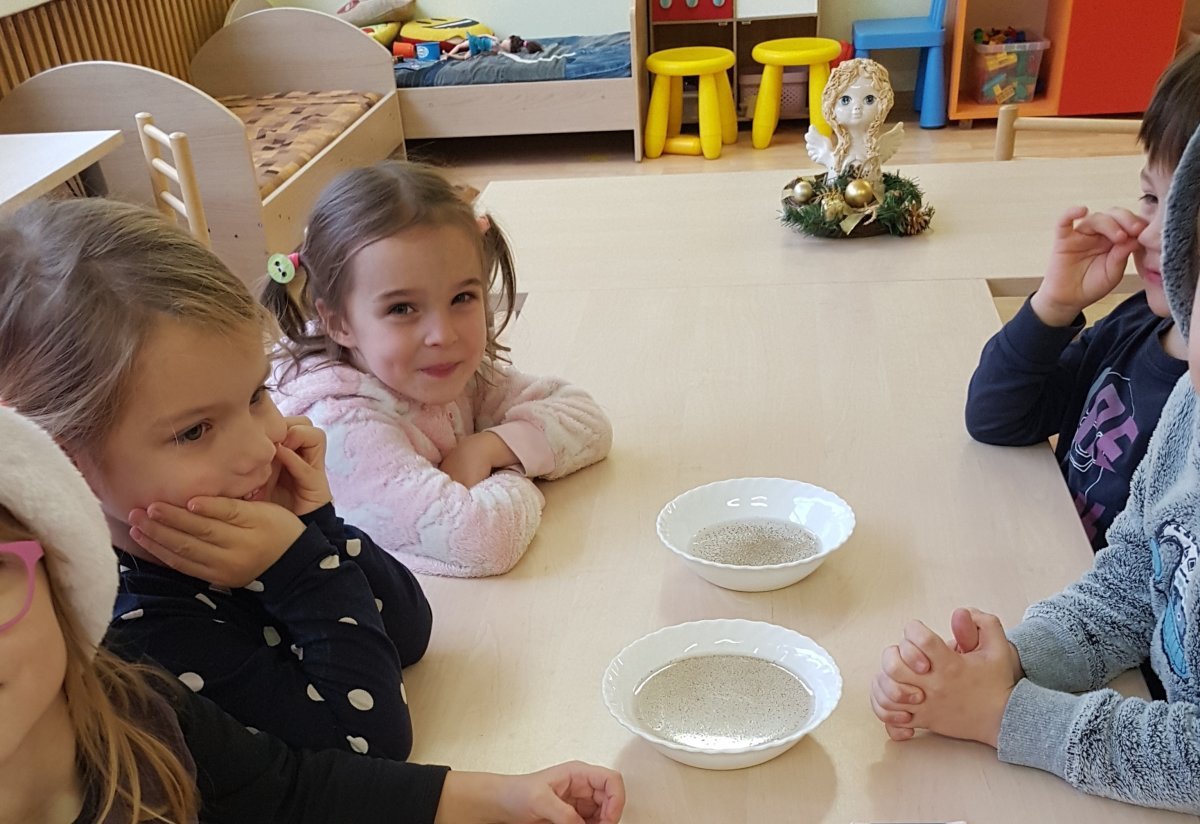 “Skruzdėliukų” grupės vaikai atliko eksperimentą “Išsigandę pipirai”. Į indelius vaikai įpylė vandens ir ant viršaus užbarstė maltų pipirų. Į kitą indelį įpylė indų ploviklio. Padažę ausų krapštuką į indų ploviklį - merkė į vandenį. Grupės vaikai stebėjo kaip pipirai „išsigąsta“ ir išsisklaido į indelio šonus. Šio eksperimento tikslas – padėti vaikams suprasti kaip indų ploviklis ar skystas muilas, dėl savo sandaros, nustumia detales nuo vandens paviršiaus.
