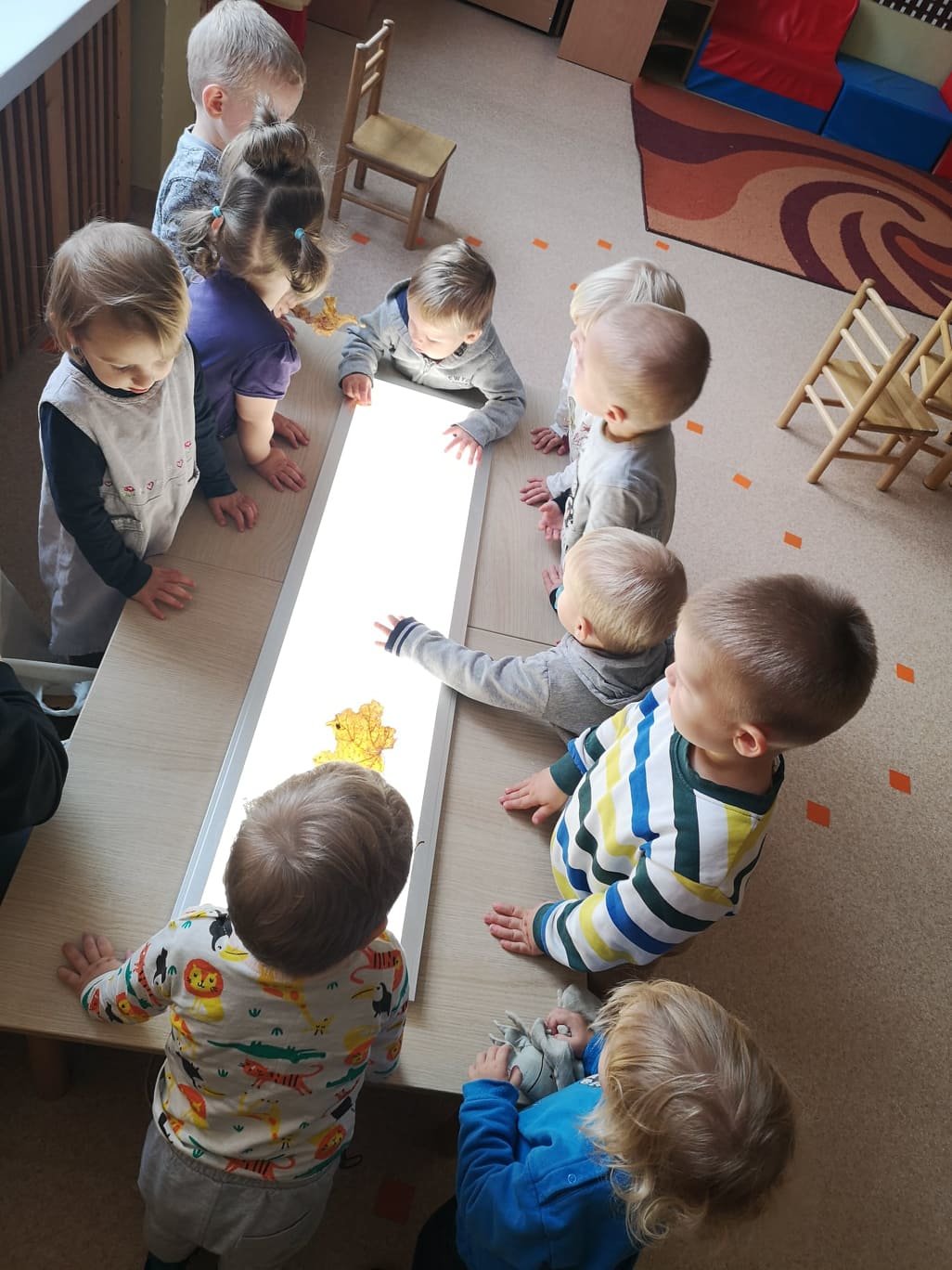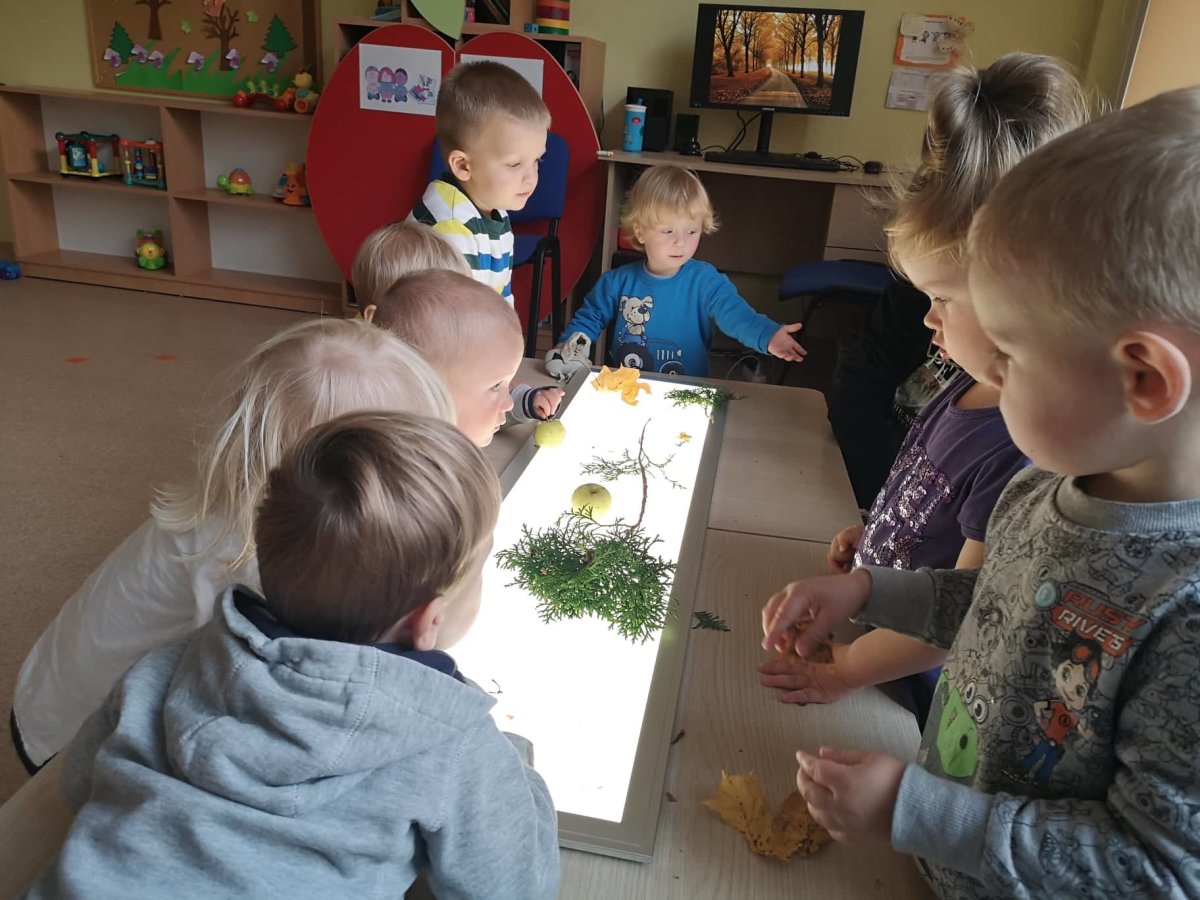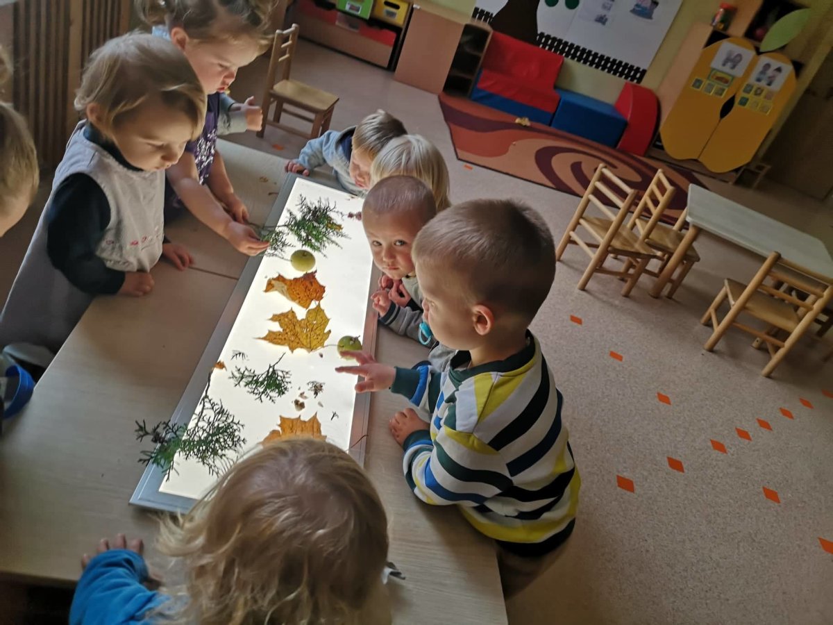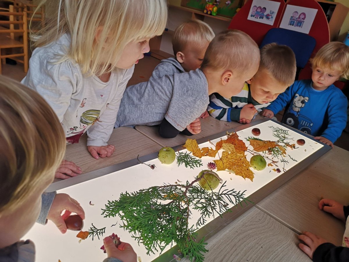 Naudojomės šviesos lenta ir gamtiniais ištekliais, juos uodėme, tyrinėjome: lapais, kaštonais, džiovintomis gėlėmis, tujos šakelėmis, obuoliukais.