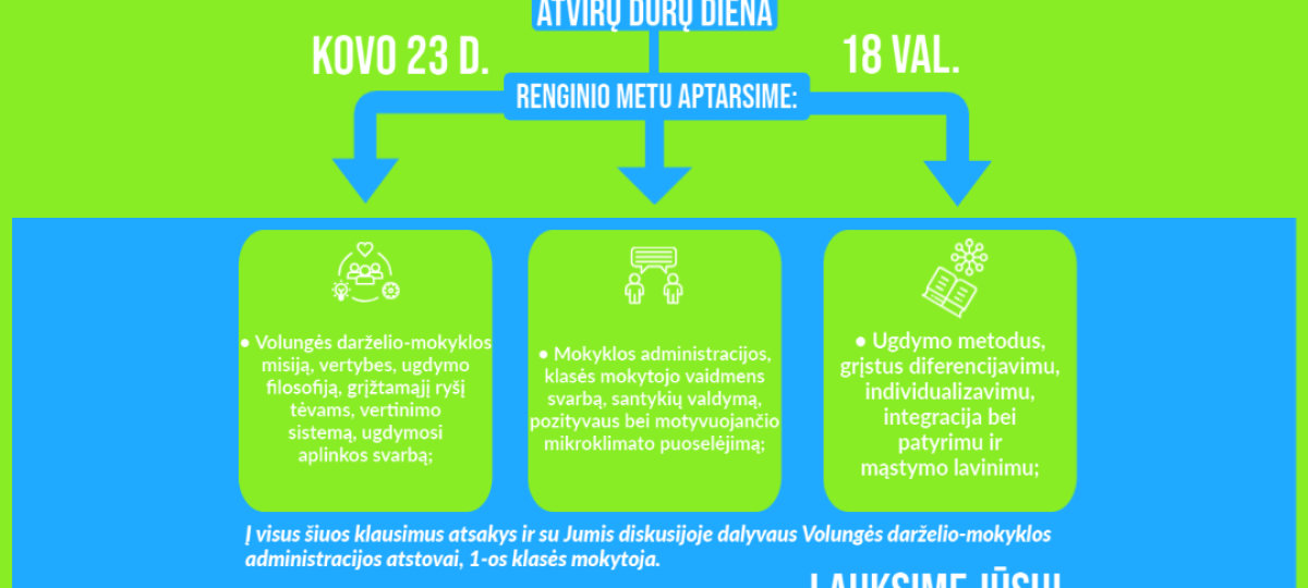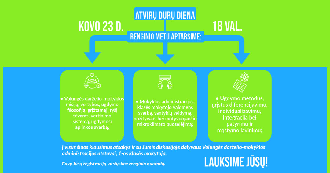 Maloniai kviečiame būsimųjų 2021-2022m.m. pirmokų tėvelius į Vilniaus Volungės darželio - mokyklos atvirų durų dieną, kuri vyks 2021 m. kovo 23 d. 18 val. nuotoliniu būdu.