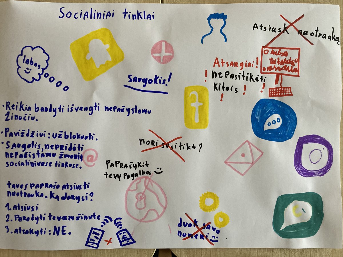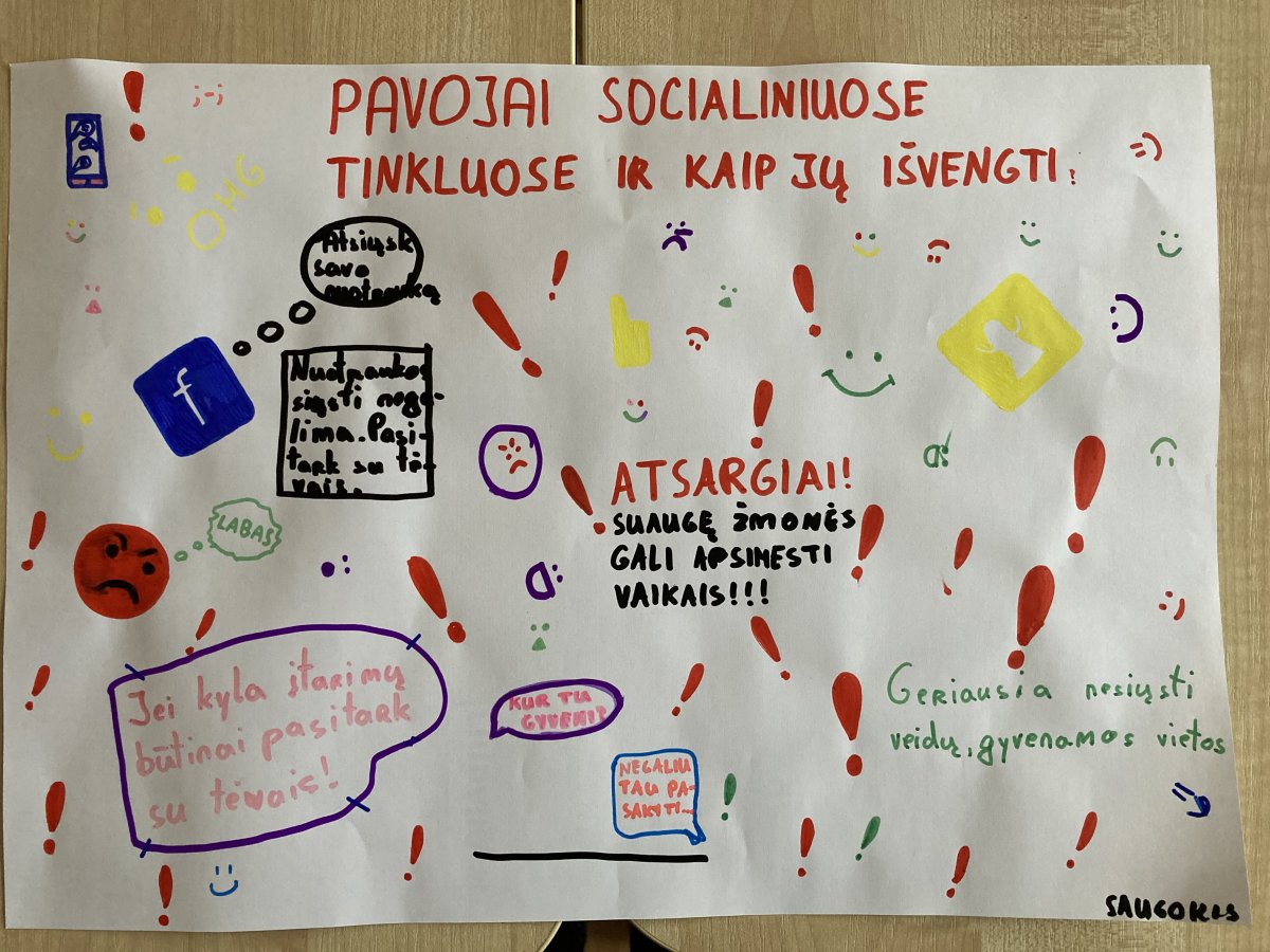 Spalio 19 dieną socialinės pedagogės kabinete su 4 klasės mokinėmis vyko prevencinis užsiėmimas ,,Socialiniai tinklai. Saugumas elektroninėje erdvėje“. Užsiėmimas parengtas, įgyvendinant LR socialinės apsaugos ir darbo ministerijos finansuojamą projektą - “Merginų ir vaikinų gebėjimų lyčių lygybės srityje stiprinimas sėkmingai smurto artimoje aplinkoje prevencijai”. Mokinės sužinojo apie socialinių tinklų privatumo nustatymus ir kokią informaciją reikia pateikti apie save socialiniuose tinkluose, kad išliktų saugios. Taip pat sukūrė informacinius plakatus draugams apie socialinių tinklų pavojus.