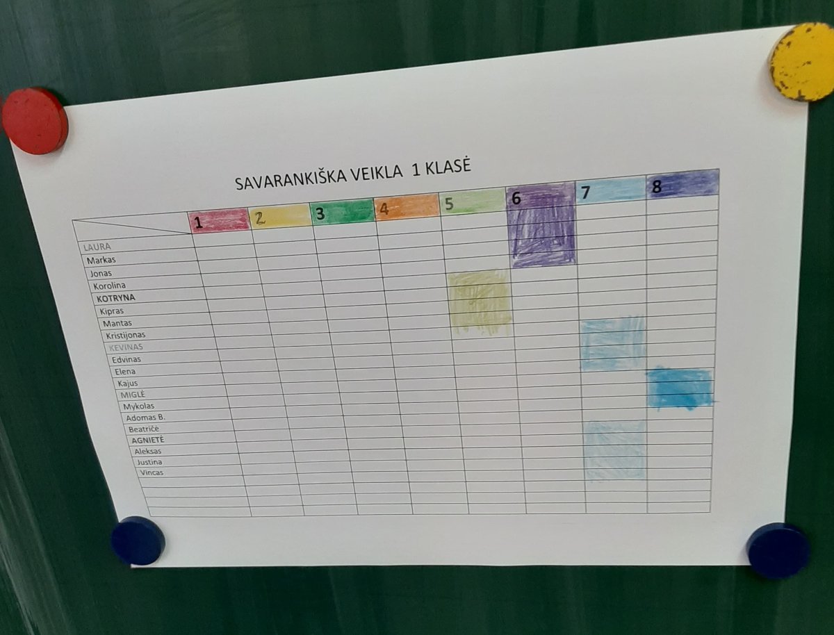 Pirmoje klasėje prasidėjo savarankiškų veiklų ciklas, kuris vyks vieną kartą per mėnesį. Pirmos klasės mokiniai mokėsi dirbti savarankiškai, dirbo grupėse. Jie galėjo rinktis norimus kryžiažodžius iš 8 duotų. Puikiai sekėsi spręsti laiptažodžius ir kryžiažodžius. Mokiniams labai patiko ši savarankiško mokymo(si) diena mokykloje.