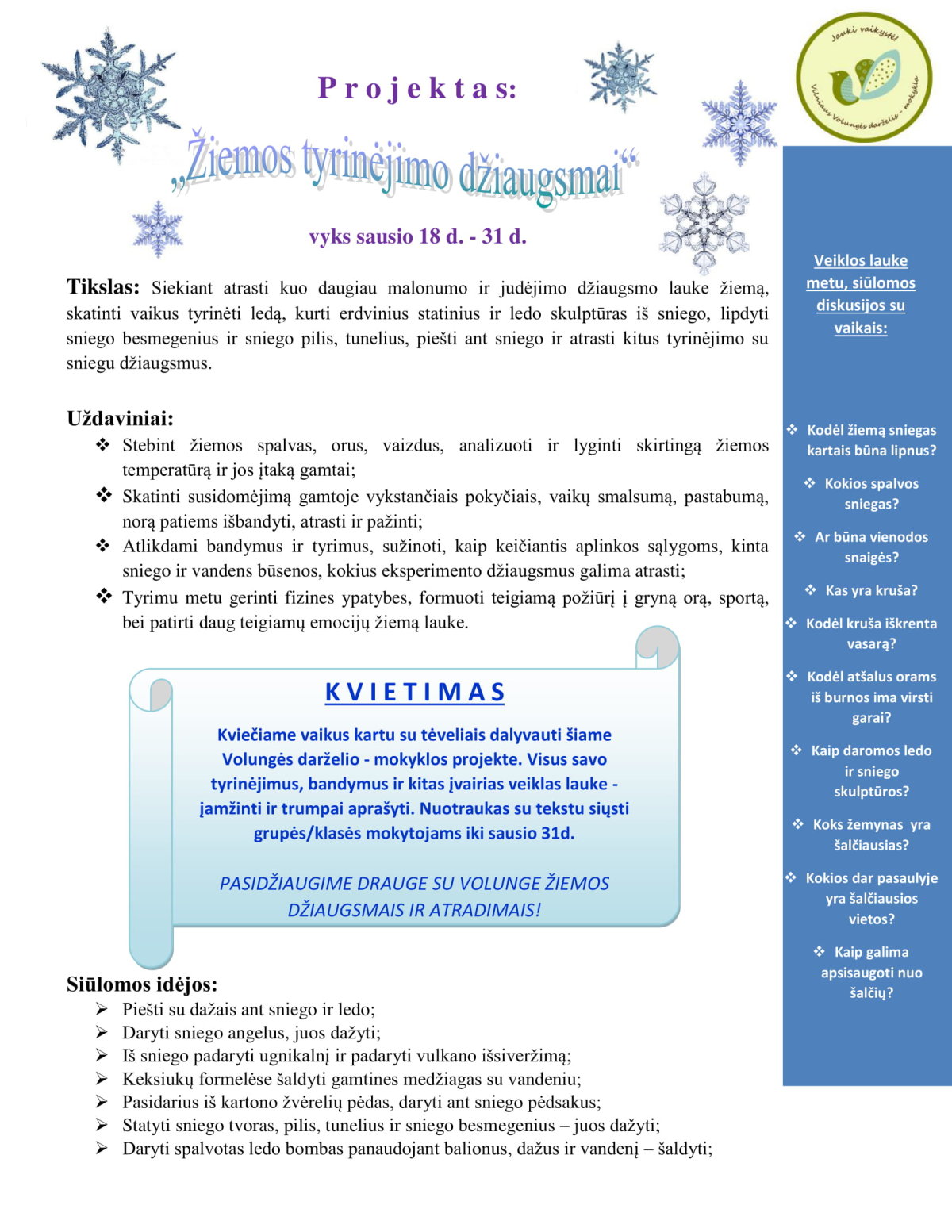Projekto idėją ir detalų aprašymą rasite kvietime (apačioje). Visų Jūsų grupės/klasės vaikų įspūdžių lauksime sausio pabaigoje. Nuotraukas siųsti el.paštu. viktorija.masiulianec@volunges.lt