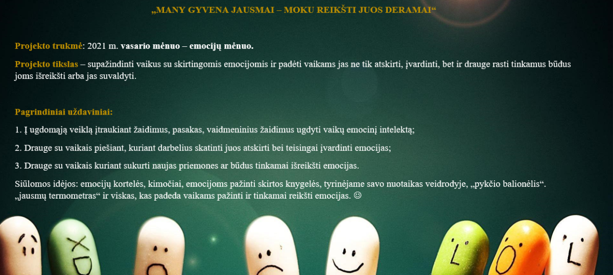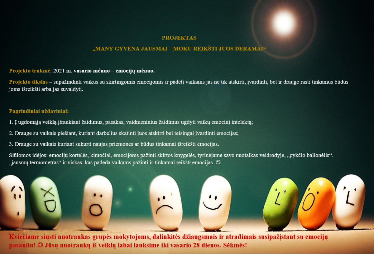 Detalesnė informacija pateikta kvietime. Labai kviečiame nuotraukas, simbolizuojančias skirtingas vaikų emocijas ar tokias, kuriose užfiksuotos veiklos, kurių metu mokotės pažinti emocijas, siųsti el.paštu dovile.leknickiene@volunges.lt. Jūsų laiškų lauksime iki vasario 28 dienos.