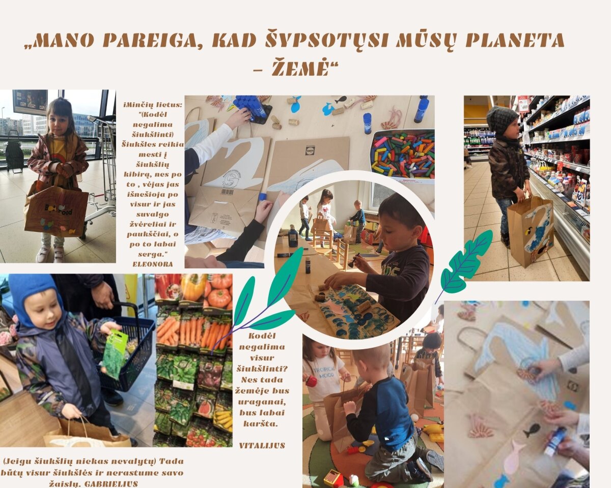 Projekto, skirto Žemės dienai metu auklėtojos su vaikais aiškinosi kaip galima žemei padėti, kodėl rūšiuojamos šiukšlės, taupomas vanduo ir elektra. Minčių lietus ryto rato metu įtraukė vaikus į apmąstymus, kuriuos siūlome paskaityti ir jums. Vėliau dekoravome pirkinių maišelius ir vaikai su tėveliais keliavo į parduotuvę mokytis atsakingo vartojimo.