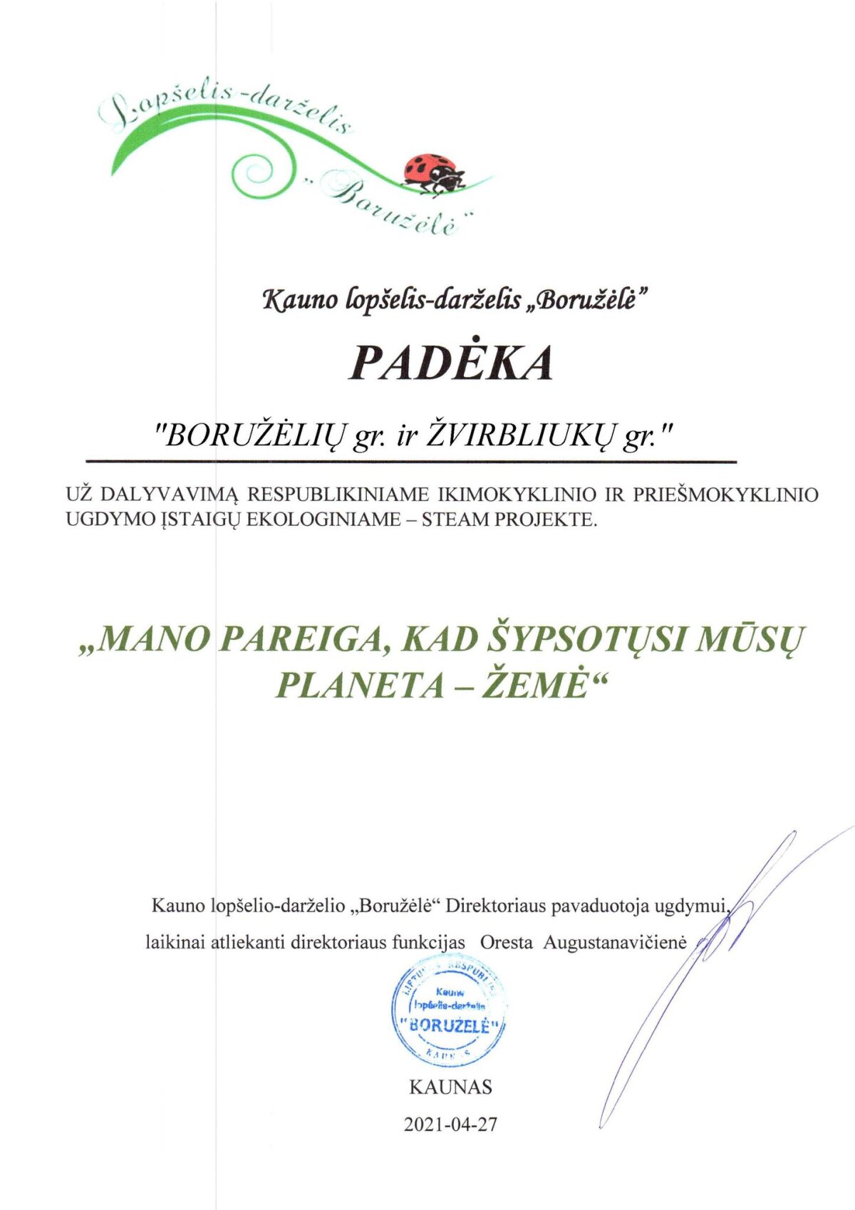 Balandžio mėnesį “Boružėlių” ir “Žvirbliukų” grupių vaikai kartu su mokytojomis Monika ir Giedre dalyvavo respublikiniame ikimokyklinio ir priešmokyklinio amžiaus vaikų ekologiniame – STEAM „Mano pareiga, kad šypsotųsi mūsų planeta – Žemė” projekte, skirtame pasaulinei Žemės dienai paminėti.