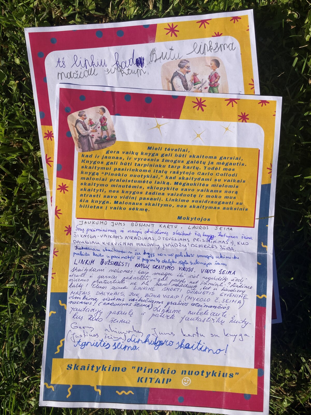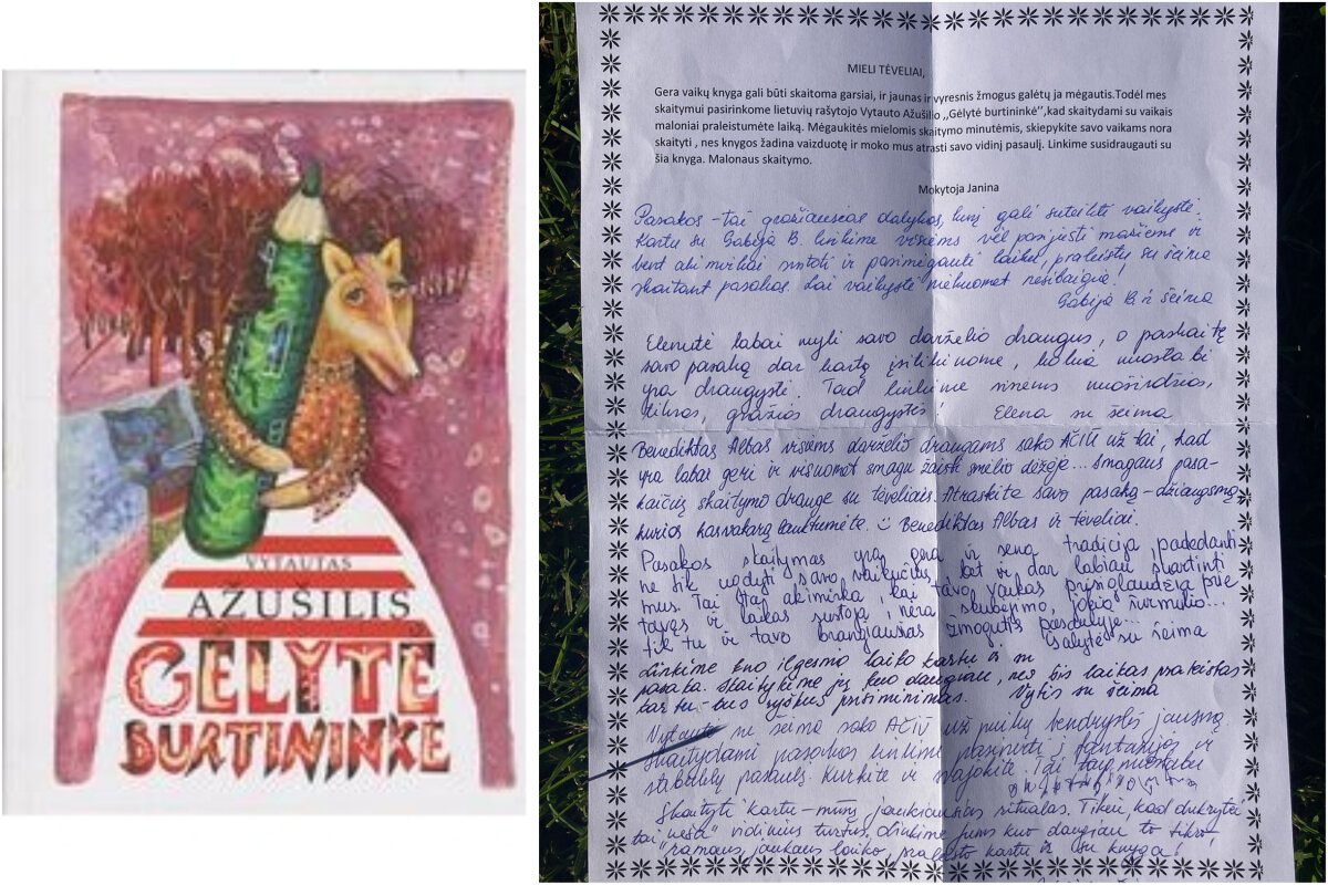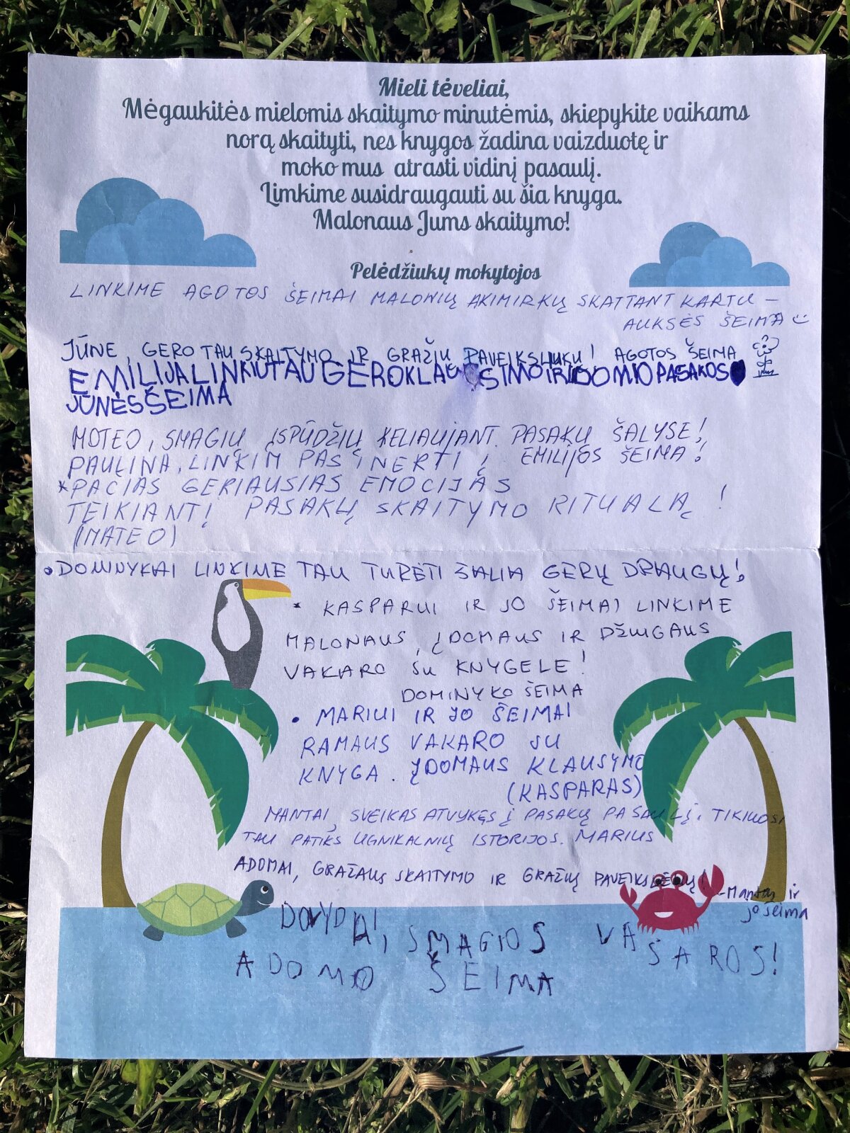 Šįkart knyga tapo tarpininku tarp kartų. Perskaitę knygos skyrių, tėvai kartu su vaikais laiške rašė linkėjimą kitai šeimai. Smagu buvo ir skaityti knygas kartu su tėvais, ir rašyti linkėjimus, nes skaitymas yra auksinis bilietas į vaiko sėkmę.