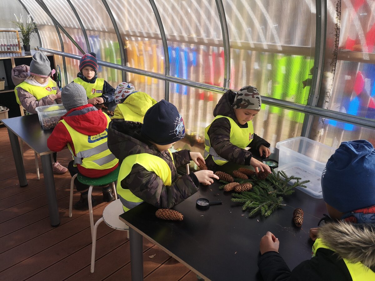 Taip pat lauko laboratorijoje pelėdžiukai ištyrinėjo ir palygino keturių medžių - pušies, eglės, beržo ir ąžuolo medžio lapus, bei jų vaisius. Pasiskirstę į keturias komandas ir ištyrinėjus savo komandos pasirinktą medį, grupės draugams pristatė: