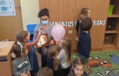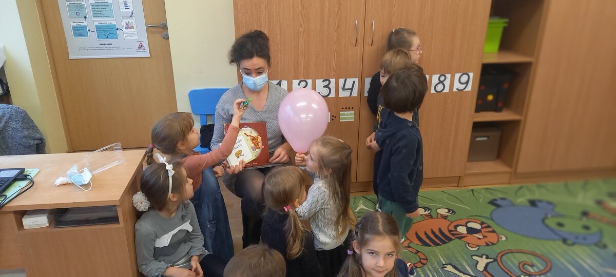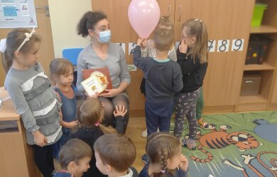 "Drugelių" grupėje vaikai dalinosi įspūdžiais ir klausėsi pasakos "Kantrybės, Pūkuotuk!". "Drugeliai" buvo labai kūrybingi ir įkvėpti pasakos – sugalvojo Pūkuotukui palinkėjimus. Vaikai linki geros nuotaikos, daug balionų, laimingos nuotaikos, daug dovanų, daug medaus, daug šokoladinių pinigų, daug sausainių, gero gimtadienio ir būti linksmam, geros sveikatos ir viso ko geriausio. Vaikai buvo labai aktyvūs, kūrybingi ir džiaugėsi, kad atšventė knygelės herojaus gimtadienį.