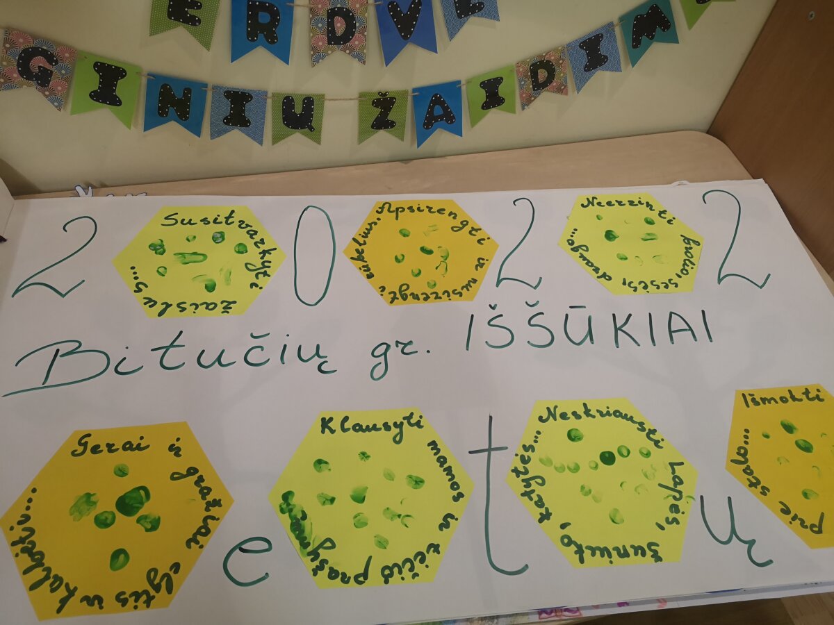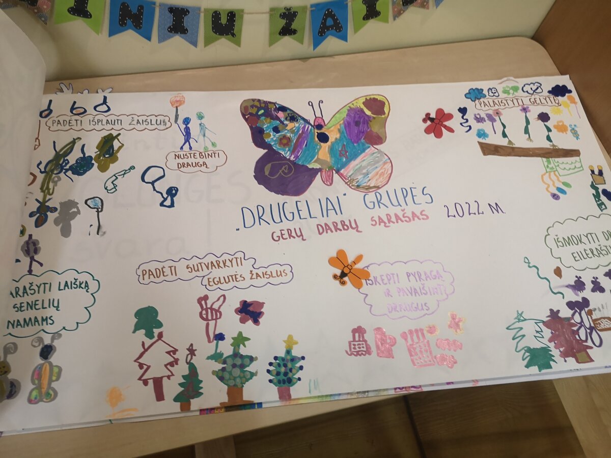 "Žiogeliai" ir "Skruzdėliukai" saugos gamtą bei padės savo mažiesiems draugams, o "Boružėlės" padės augti gėlėms, užjaus kitus ir kitais metais pasižada būti dosnūs. "Žvirbliukai" labai pasižada kitais metais klausytis auklėtojų, gražiai elgtis ir taip pat sukurti daugiau įdomių darbelių. Priešmokyklinukai "Pelėdžiukai" ir "Drugeliai" priėmė atsakomybę ir kiekvienas sau pasižadėjo individualų pasižadėjimą. O pasižadėjimų knygoje rasite įvairius: išbandyti naujas skaitymo korteles, tausoti gamtą, išmokti greitai skaičiuoti, dainuoti visiems daineles, parašyti laišką senelių namas, nustebinti draugą, iškepti pyragą bei pavaišinti draugus ir prieš kažką darant – gerai pagalvoti.