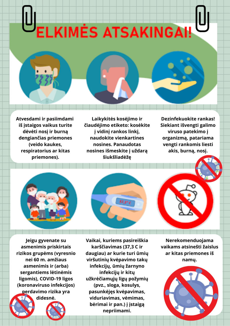 Visomis reikiamomis priemonėmis, kurios reikalingos ugdymo įstaigoje – termometrais, apsaugos priemonėmis (veido apsaugos kaukės, vienkartinės pirštinės, dezinfekcinis skystis, skydai ir kt.) – pasirūpina įstaiga ir steigėjas. Iš tėvų nereikalaujame reikiamų priemonių ir primename, kad bet kokios rinkliavos iš tėvų yra griežtai draudžiamos.