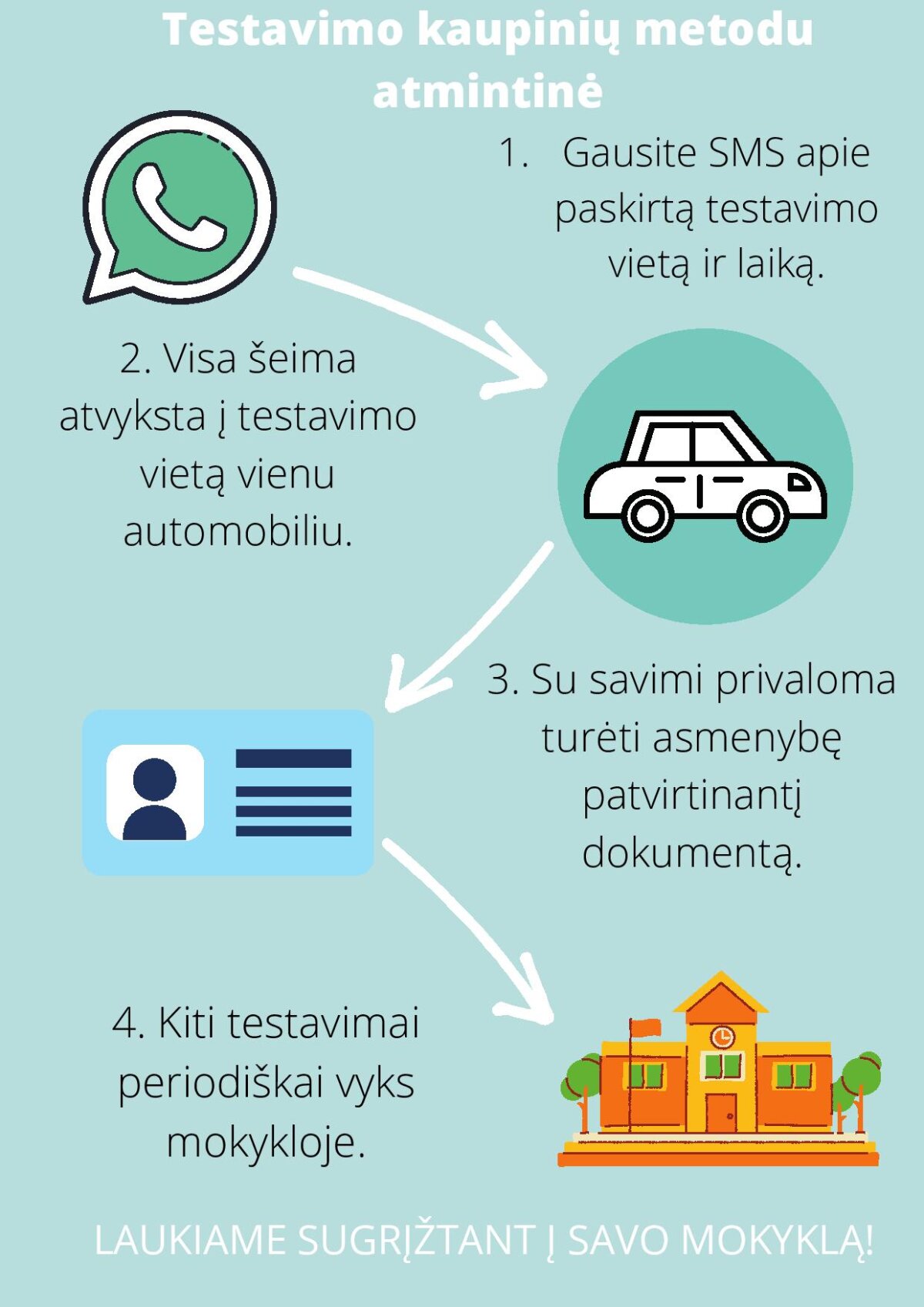- Pirmą kartą testuotis į mobilųjį punktą būtina atvykti visiems vieno namų ūkio nariams vienu automobiliu, adresu V. Gerulaičio g. 1. Neturintiems galimybių atvykti į punktą automobiliu, galima iš anksto užsisakyti pavėžėjimo paslaugą telefonu: (85)2112555.