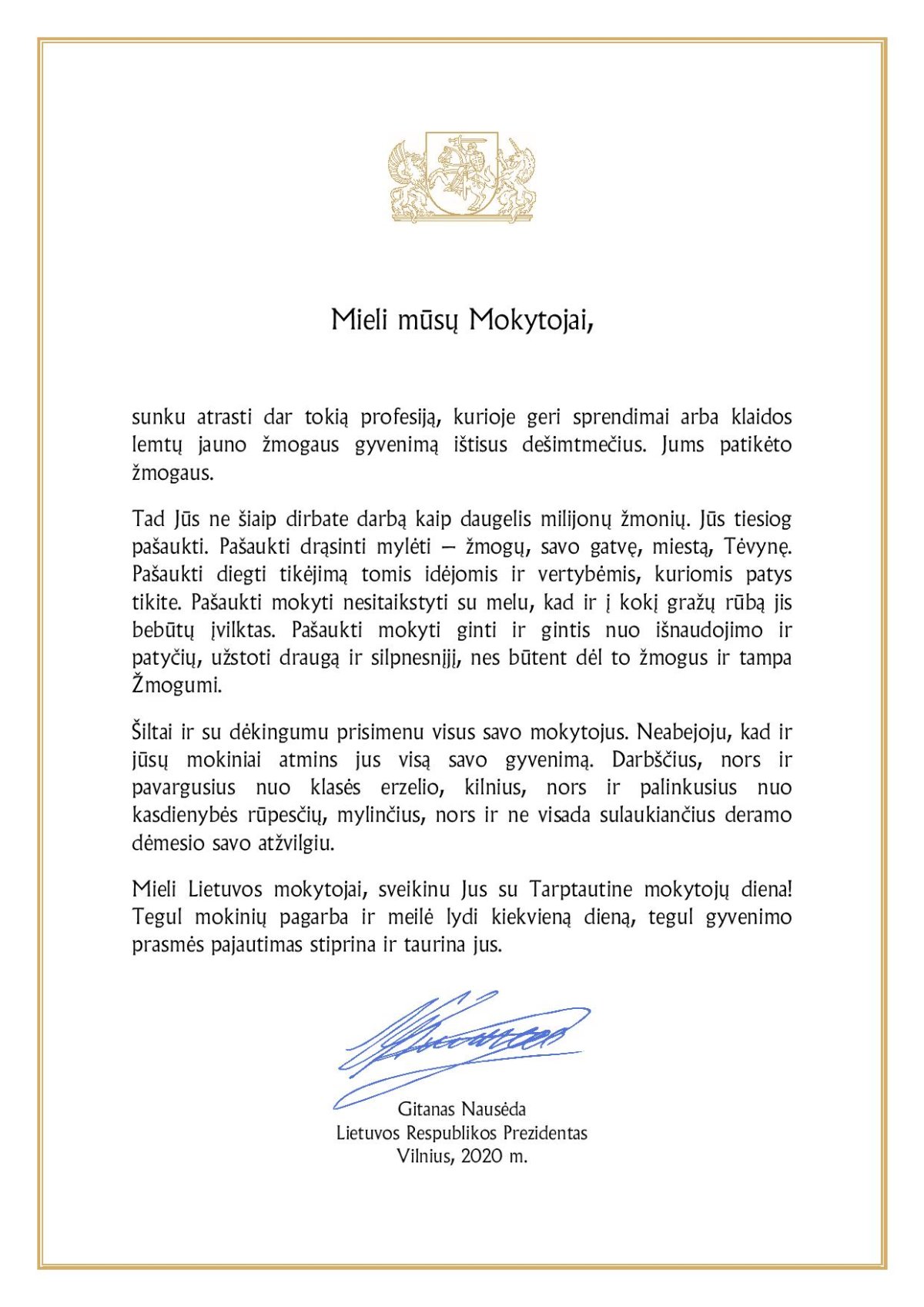 LR Prezidento ir Vilniaus mero sveikinimai mokytojams
